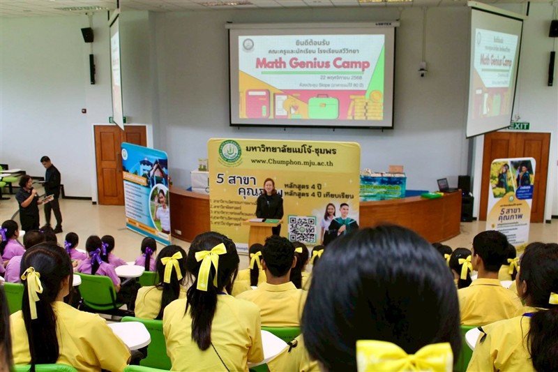 นที่ 22 พฤศจิกายน 2568 เวลา 08.30 น. ณ ห้องประชุมใหญ่ Slope (อาคารแม่โจ้ 80 ปี) อาจารย์วิชชุดา เอื้ออารี รองคณบดีมหาวิทยาลัยแม่โจ้-ชุมพร ฝ่ายกิจการพิเศษ เป็นประธานเปิดค่ายอัจริยภาพทางคณิตศาสตร์ (Math Genius Camp) โดยมีนางสาวจตุพร สิ้นทุกข์ ครู วิทยฐานะครูชำนาญการพิเศษ หัวหน้ากลุ่มสาระฯคณิตศาสตร์ กล่าวรายงานวัตถุประสงค์การจัดค่าย พร้อมกันนี้ นางสาวเกตุวดี บุญเปีย รองผู้อำนวยโรงเรียนสวีวิทยากลุ่มบริหารวิชาการ ได้พบปะพร้อมกับให้กำลังใจแก่นักเรียนและคณะครูที่เข้าร่วมค่ายอัจริยภาพทางคณิตศาสตร์ในครั้งนี้