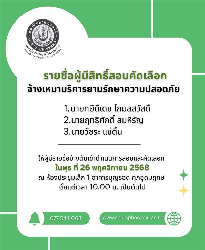 ให้ผู้มีรายชื่อข้างต้นเข้าดำเนินการสอบและคัดเลือก ในพุธ ที่ 26 พฤศจิกายน 2568 ณ ห้องประชุมเล็ก 1 อาคารบุญรอด ศุภอุดมฤกษ์ ตั้งแต่เวลา 10.00 น. เป็นต้นไป