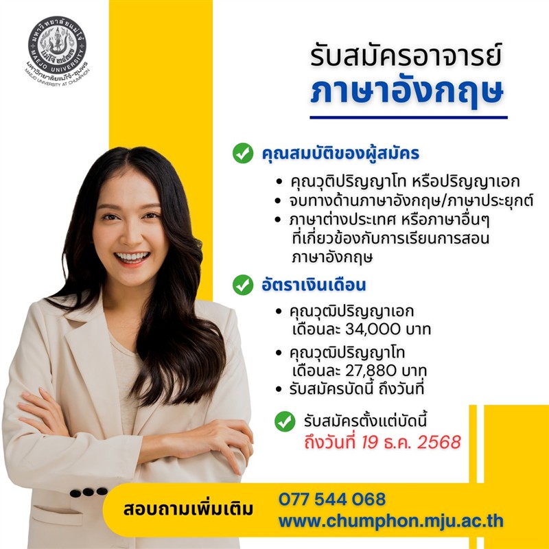 2.ตำแหน่งอาจารย์ภาษาอังกฤษ คุณวุฒิปริญญาโท-เอก จำนวน 1 อัตรา : https://shorturl.asia/tCxIB