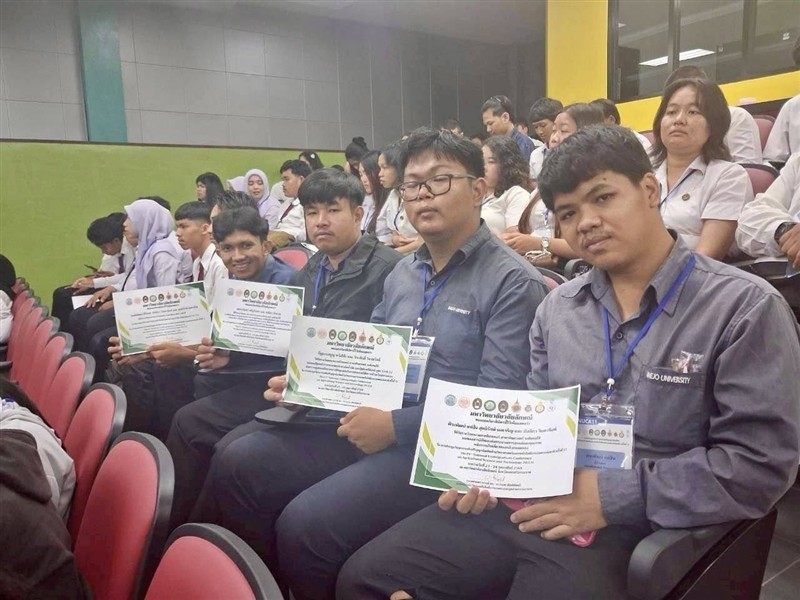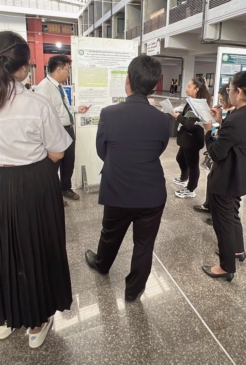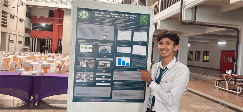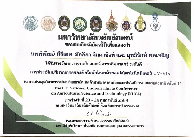 - รางวัลการนำเสนอผลงานภาคโปสเตอร์ ระดับดี จำนวน 1 รางวัล เรื่อง “การประเมินปริมาณกรดแกลลิกในผักไชยาด้วยสเปกโตรโฟโตมิเตอร์ UV–Vis โดย นายนพพิพัฒน์ คีรีเดช”