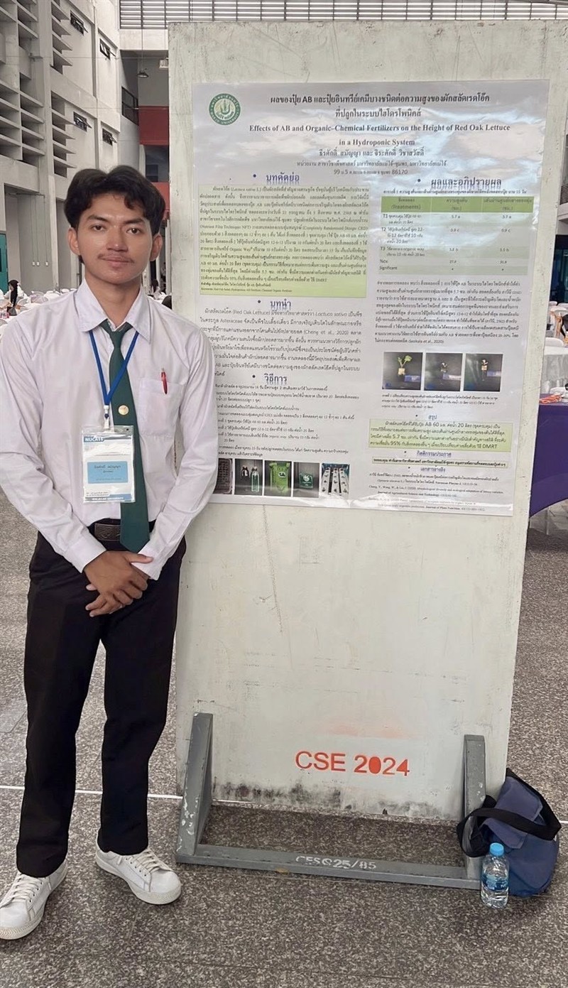 1.เรื่อง “ผลของปุ๋ย AB และปุ๋ยอินทรีย์เคมีบางชนิดต่อความสูงของผักสลัดเรดโอ๊คที่ปลูกในระบบไฮโดรโพนิคส์“ โดย นายธีรศักดิ์ สมัญญา