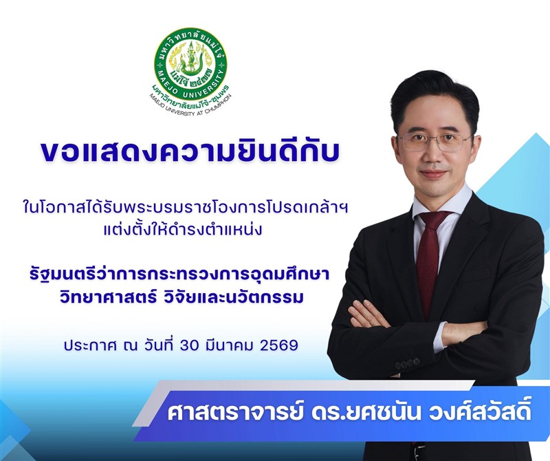 มหาวิทยาลัยแม่โจ้-ชุมพร ขอแสดงความยินดีกับ ศาสตราจารย์ ดร.ยศชนัน วงศ์สวัสดิ์