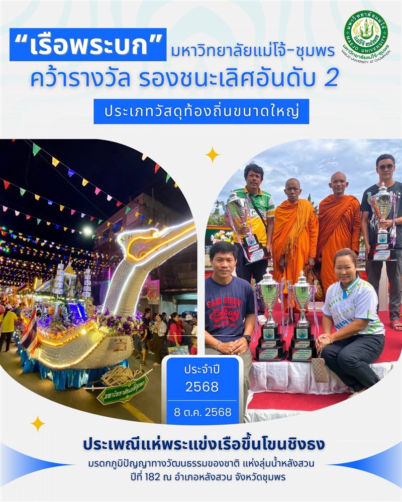 ทั้งนี้ บุคลากรและนักศึกษา มหาวิทยาลัยแม่โจ้-ชุมพร ได้ร่วมแรงร่วมใจออกแบบและจัดทำ “เรือพระบก” โดยได้รับการสนับสนุนงบประมาณจากกองส่งเสริมศิลปวัฒนธรรม มหาวิทยาลัยแม่โจ้ จังหวัดเชียงใหม่ ภายใต้แนวคิด “ใช้วัสดุจากท้องถิ่นอย่างสร้างสรรค์” เพื่อสื่อถึงอัตลักษณ์แห่งความพอเพียง รากเหง้าของภูมิปัญญา และความผูกพันกับชุมชน ผลจากความตั้งใจและความร่วมมือในครั้งนี้ ส่งผลให้เรือพระบกของมหาวิทยาลัยแม่โจ้-ชุมพร ได้รับรางวัลรองชนะเลิศอันดับ 2 ประเภทวัสดุท้องถิ่นขนาดใหญ่ นับว่าเป็นอีกหนึ่งความภาคภูมิใจของชาวแม่โจ้-ชุมพร ที่ได้มีส่วนร่วมในการสืบสานและอนุรักษ์มรดกภูมิปัญญาทางวัฒนธรรมของชาติ ตลอดจนเป็นการส่งเสริมให้นักศึกษาได้เรียนรู้การทำงานร่วมกับชุมชนและสืบทอดคุณค่าทางวัฒนธรรมท้องถิ่นอย่างยั่งยืนต่อไป